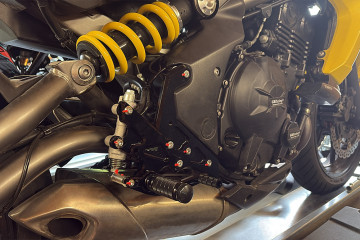 Dank der Verlegung der Fußrastenanlage, ist es vorbei mit der zwangsläufigen Liegeposition und den schmerzhaften Handgelenken auf dem Supersportler nachdem Sie kilometerweise Asphalt zurückgelegt haben. Für diejenigen die Roadster oder Tourer bevorzugen, aber eine zu gerade Sitzposition und fehlende Sportlichkeit bedauern, ermöglicht die zurückgelegte Fußrastenhalterung es auch hier einen guten Kompromiss zu finden !
