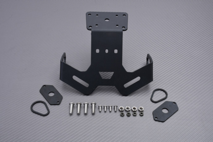 Kennzeichenhalterung aus Stahl, passend für die genannten Motorräder, ohne dass Sie Veränderungen vornehmen müssen. Sie wird direkt an den Befestigungspunkten des ursprünglichen Lätzchen/Halterung befestigt, so dass Sie die Heckverkleidung für die Montage nicht erneut bohren müssen.