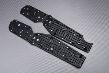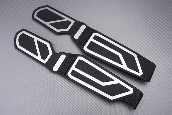 Poggiapiedi anteriori e posteriori in alluminio intagliato nella massa e anodizzato, venduto il kit completo. Le foto sono contrattuali e mostrano queste parti come le riceverai. Nessuna modifica da apportare durante l'assemblaggio, che avviene nello stesso punto delle pedane originali. Basta rimuovere quelle vecchie e sostituirle con le nuove pedane.
